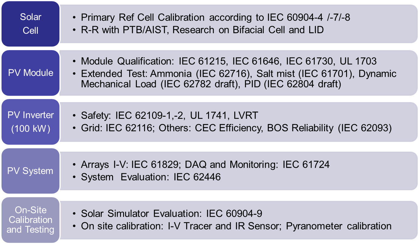 Under the support by the Bureau of Energy and the Ministry of Economic Affairs, the Industrial Technology Research Institute (ITRI) established the first IECEE certified Photovoltaic Testing Laboratory in Taiwan. Specific equipment and technologies have been developed by ITRI for PV performance and safety tests, which are performed according to IEC PV standards.
